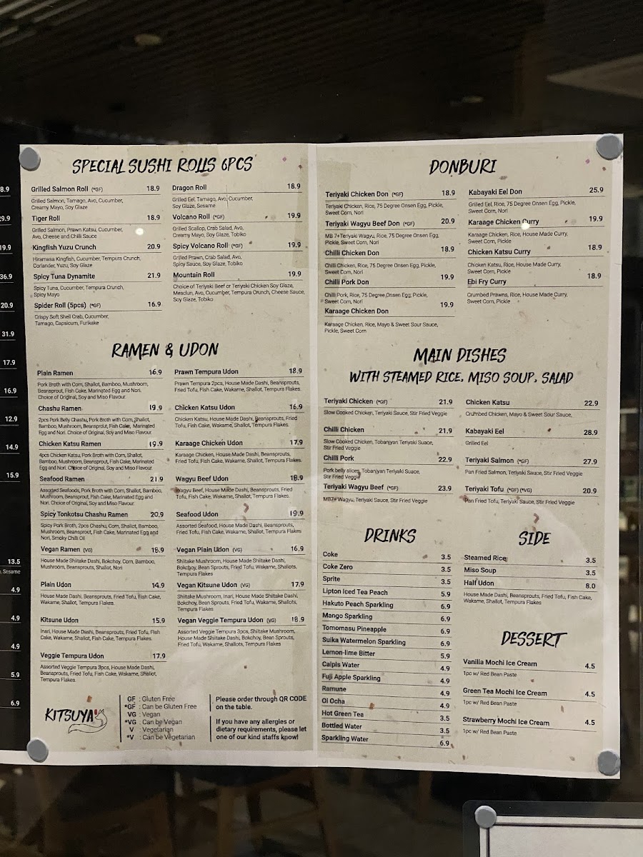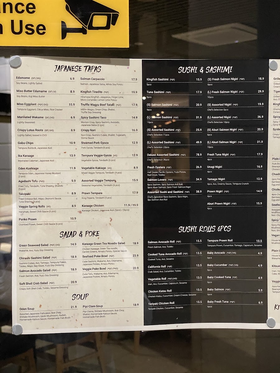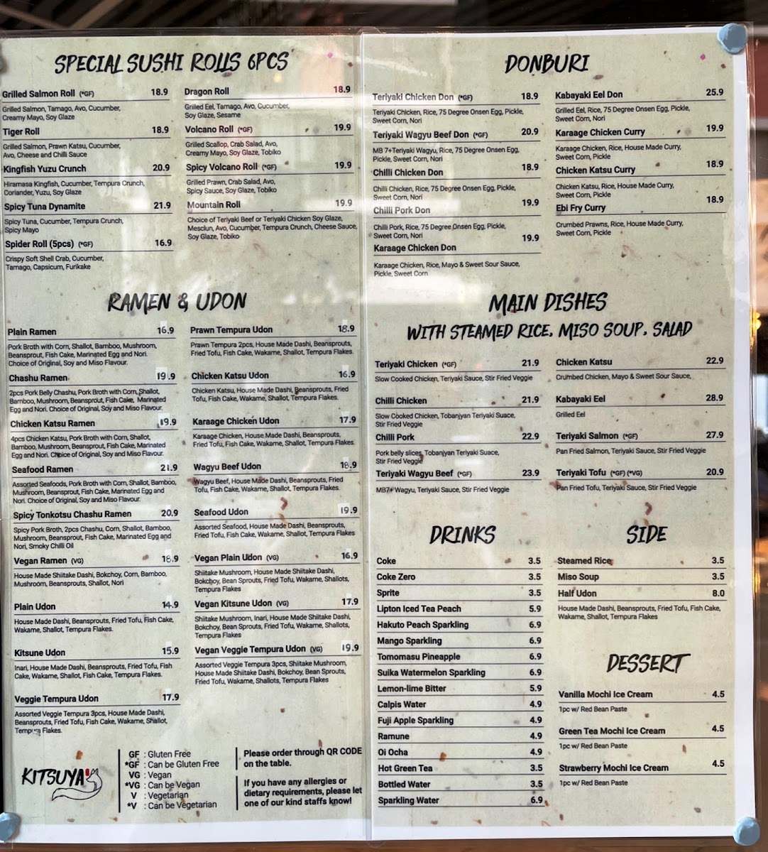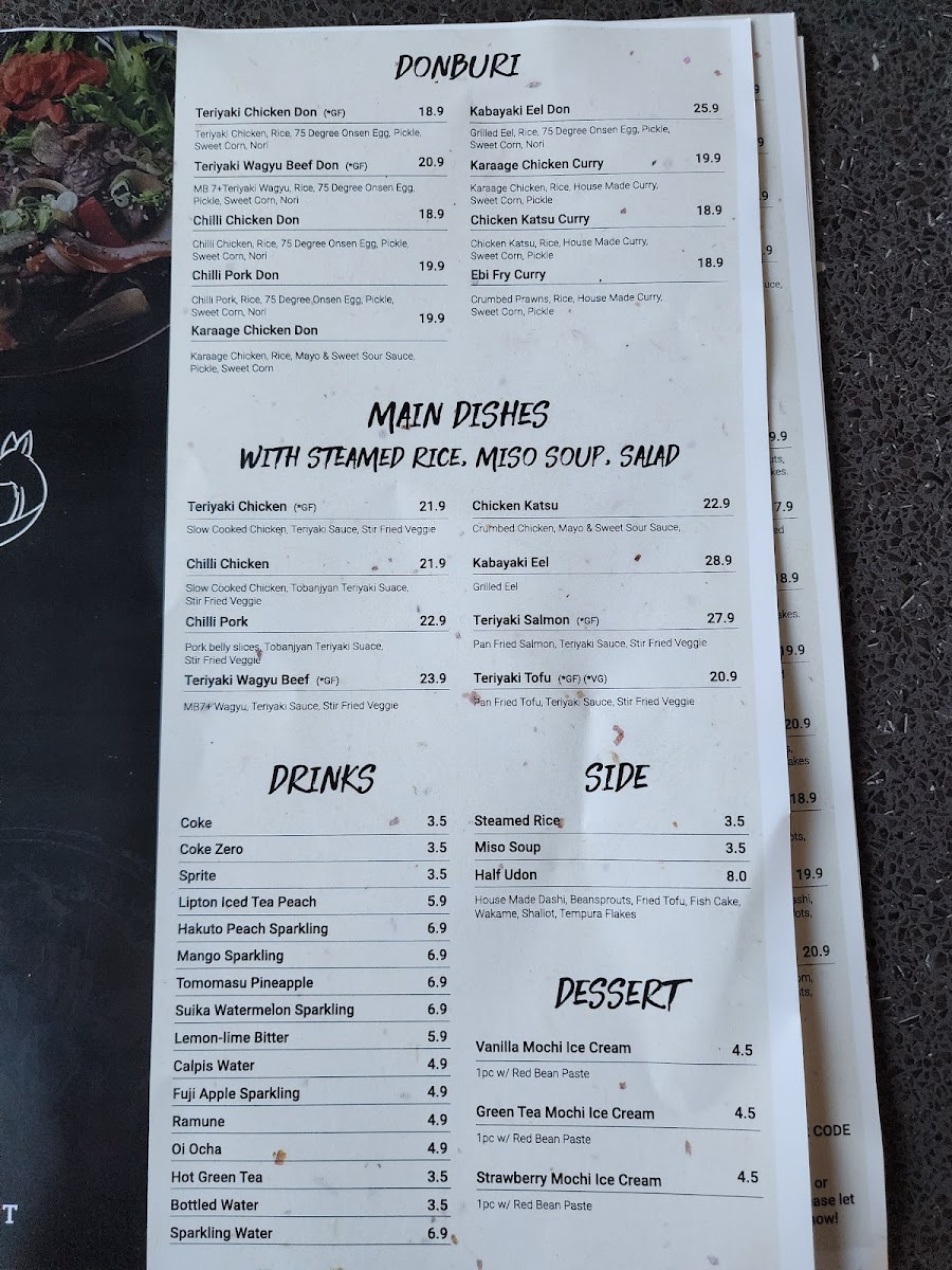 For those seeking warm dishes, the menu includes Japanese hot pot selections like the Oden Soup, which contains assorted fish cakes, shiitake mushrooms, and house-made dashi broth served in a personal-sized hotpot. Additionally, ramen options such as Chicken Ramen and Spicy Tonkotsu Chashu Ramen are highlighted, alongside rice bowls like Chicken Karaage Donburi.