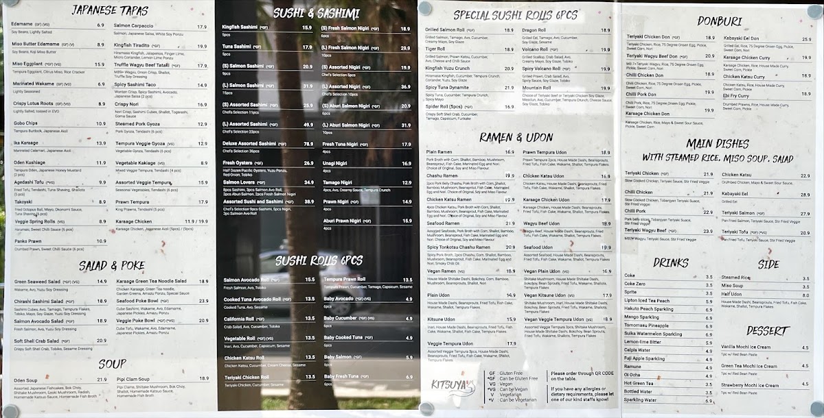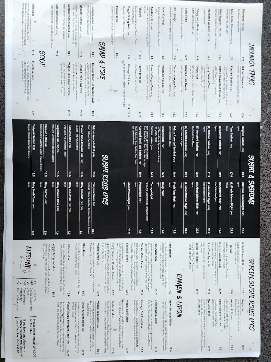 The menu at Kitsuya Japanese Restaurant offers a variety of traditional and contemporary Japanese dishes organized into several key categories. Visitors can explore a selection of sushi and sashimi, featuring options such as assorted nigiri sushi, salmon sashimi, fresh tuna nigiri, and unagi nigiri. There are also carefully composed platters including a Traditional Roll Platter and a Party Sashimi Platter, providing a range of rolls and sashimi pieces ideal for groups or sharing.